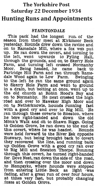 This was a hunt of 2 hours, and included a 3½ mile point from Head House Farm. It is among the finest of the pack's moor hunts since 1922, and a fitting conclusion for the year 1936, in which hounds have shown some excellent sport.